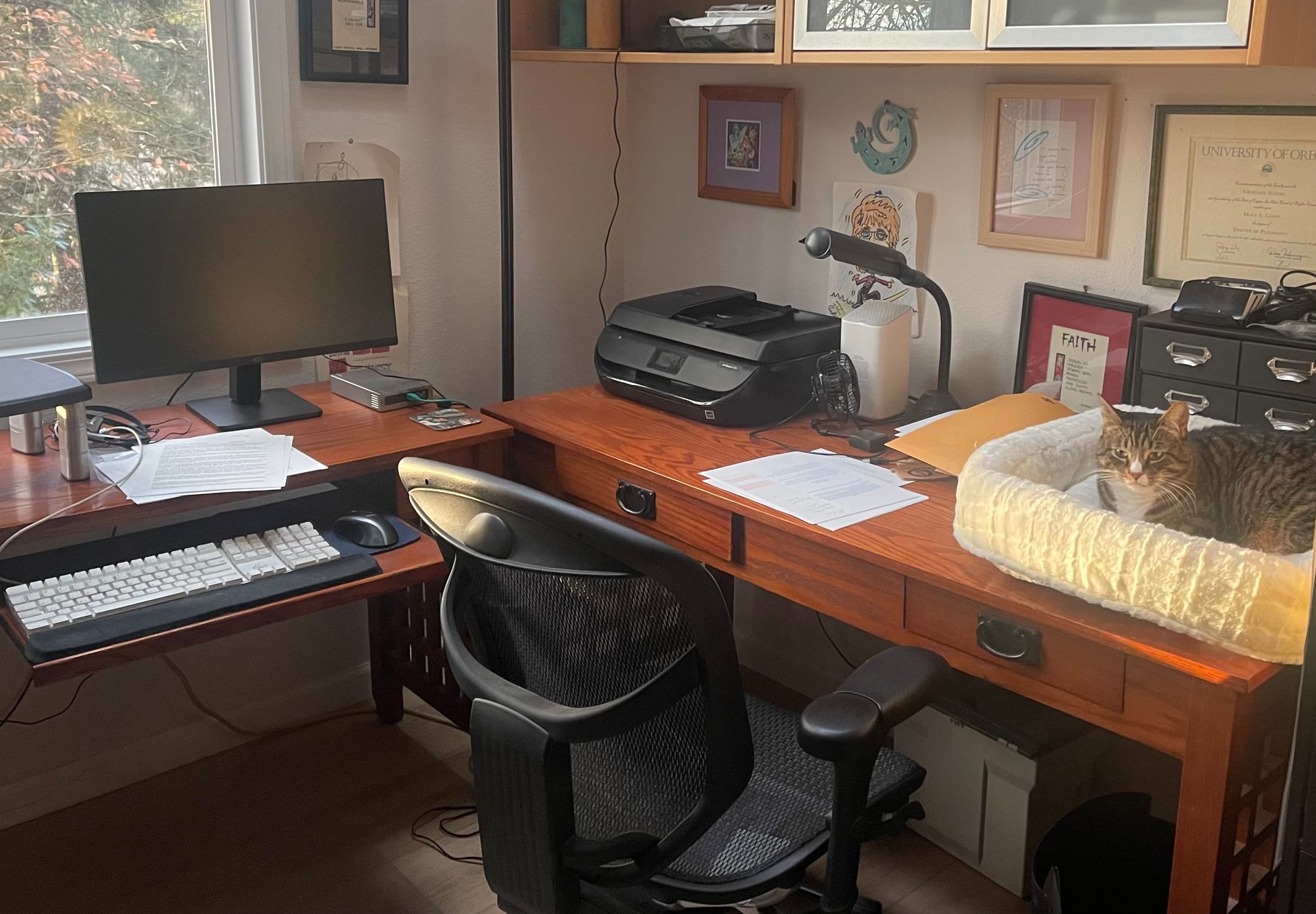 I often create all by myself, except for my feline creativity buddy, in my home writing niche (see photo). I write or edit a mean sentence, paragraph, essay or book. However, my writing and editing projects often step into facilitating and co-creating products that ring authentic to you, your organization and your audience.